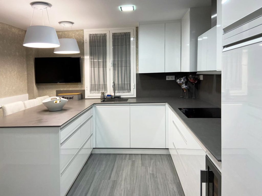 En este diseño se combinan el tono blanco del mobiliario con el gris neutro de la encimera “Pietra di Piombo”, junto a la solería grisácea, buscan un acabado más agradable y hogareño.